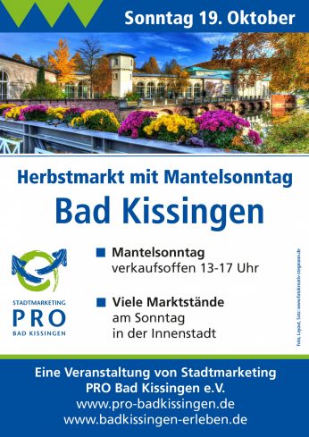 Die kalte Jahreszeit steht vor der Türe und die neue bunte Herbst-/Winterkollektion präsentiert sich in den Schaufenstern und Geschäften. Bad Kissingen lädt ein zum Herbstmarkt am 19.10.2025 mit traditionellem offenen Mantelsonntag von 13 – 17 Uhr.